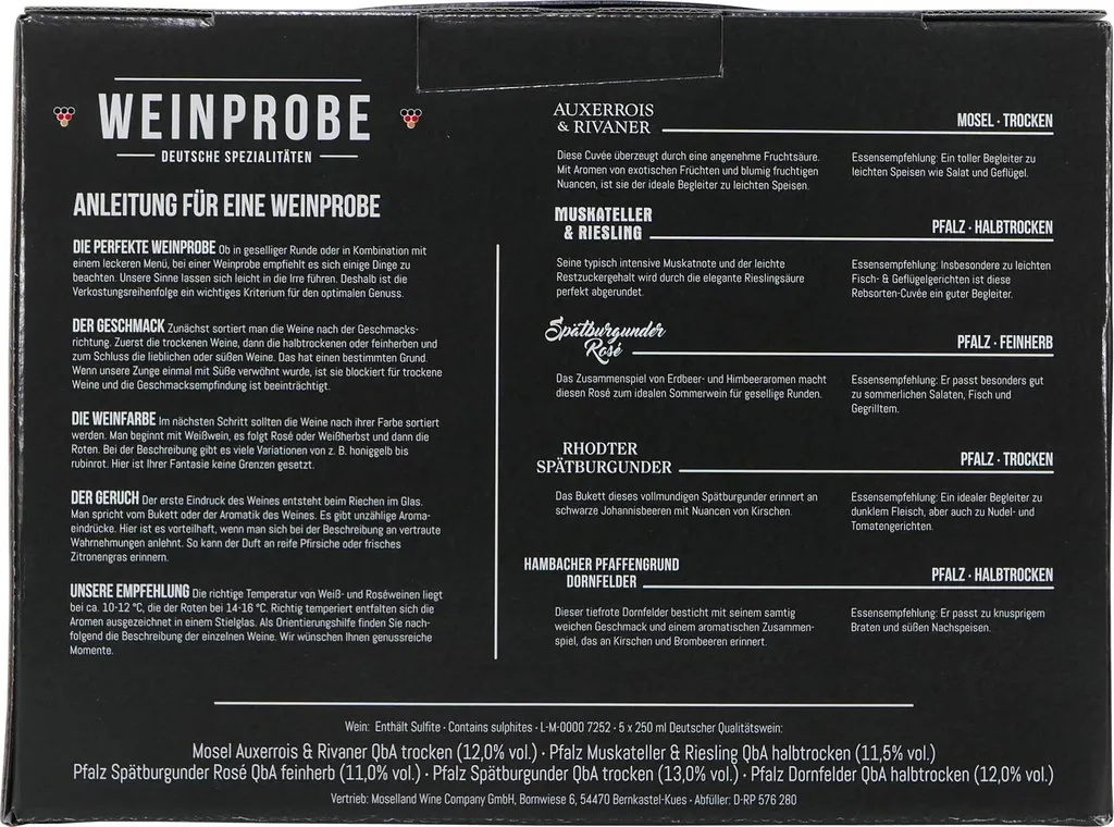 Schreibe die erste Rezension für „Moselland 5er Geschenkpack Weinprobe Rebsorten Spezialitäten 5 X 250ml“ Antwort abbrechen